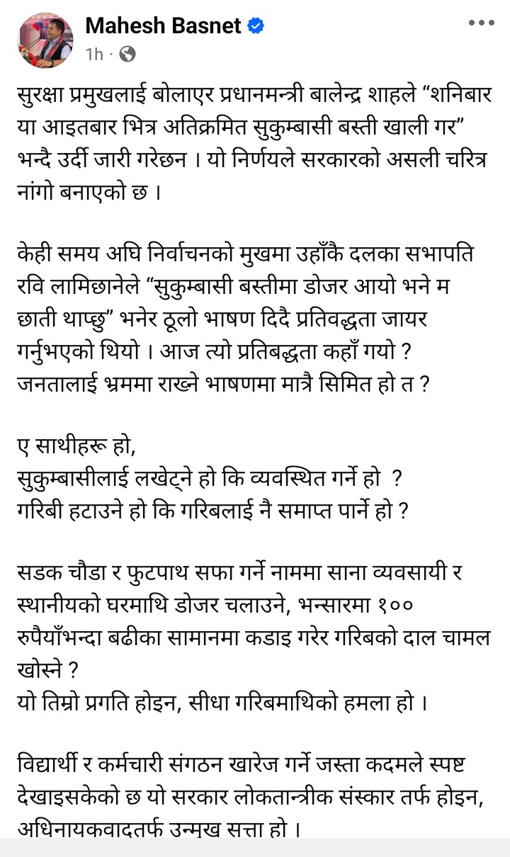 सामाजिक सञ्जालमार्फत उनले भनेका छन्,‘सुरक्षा प्रमुखलाई बोलाएर प्रधानमन्त्री बालेन्द्र शाहले ‘शनिबार–आइतबारभित्र अतिक्रमित सुकुम्वासी बस्ती खाली गर’ भन्दै उर्दी जारी गरेछन्। यो निर्णयले सरकारको असली चरित्र नांगो बनाएको छ। उनकै दलका सभापति रवि लामिछानेले ‘सुकुम्वासी बस्तीमा डोजर आयो भने म छाती थाप्छु” भनेर ठुलो भाषण दिनुहुन्थ्यो। आज त्यो प्रतिबद्धता कहाँ गयोरु जनतालाई भ्रममा राख्ने भाषण मात्रै हो त।’