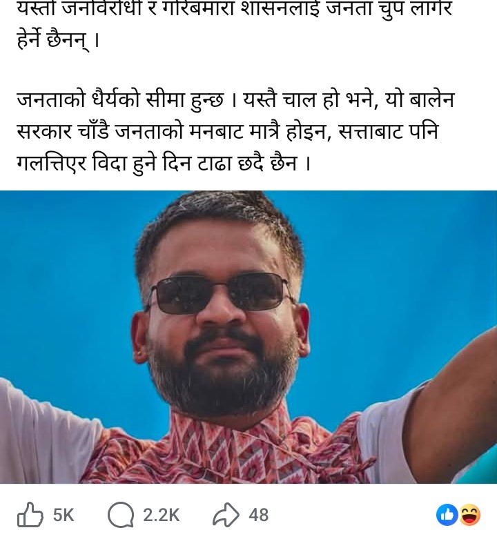 उनले प्रश्न गरेका छन्, ‘सुकुम्बासीलाई लखेट्ने हो कि व्यवस्थित गर्नेरुगरिबी हटाउने हो कि गरिबलाई नै समाप्त पार्नेरु सडक चौडा र फुटपाथ सफा गर्ने नाममा साना व्यवसायी र स्थानीयको घरमाथि डोजर चलाउने, भन्सारमा १०० रुपैयाँभन्दा बढीका सामानमा कडाइ गरेर गरिबको दाल–चामल खोस्ने ! यो तिम्रो प्रगति होइन, सीधा गरिबमाथिको हमला हो। विद्यार्थी र कर्मचारी संगठन खारेज गर्ने जस्ता कदमले स्पष्ट देखाइसकेको छ। यो सरकार लोकतान्त्रिक संस्कार तर्फ होइन, अधिनायकवादतर्फ उन्मुख सत्ता हो। यस्तो जनविरोधी र गरिबमारा शासनलाई जनता चुप लागेर हेर्ने छैनन्।’