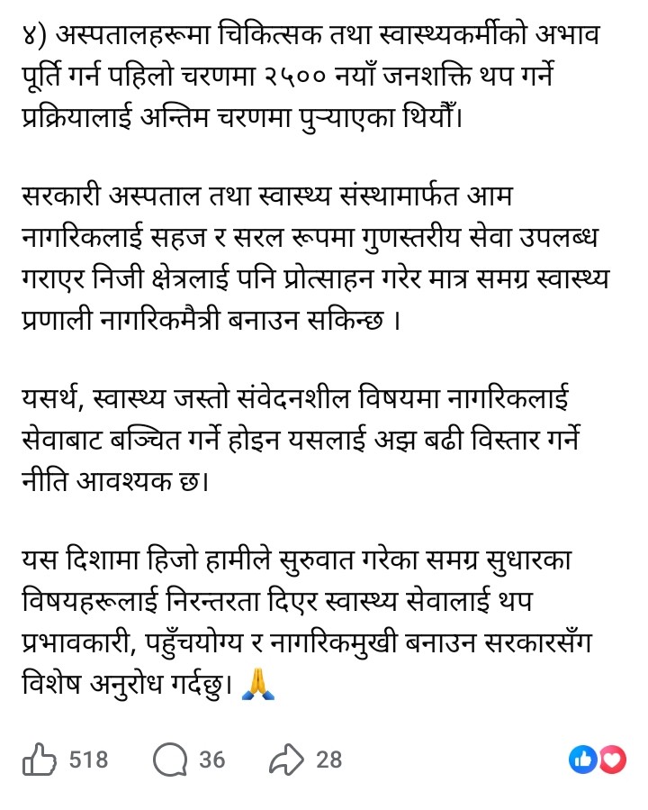 उनले आफ्नो पालामा सुरुवात गरिएका समग्र सुधारका विषयहरूलाई निरन्तरता दिएर स्वास्थ्य सेवालाई थप प्रभावकारी, पहुँचयोग्य र नागरिकमुखी बनाउन सरकारसँग विशेष अनुरोध पनि गरेका छन् ।