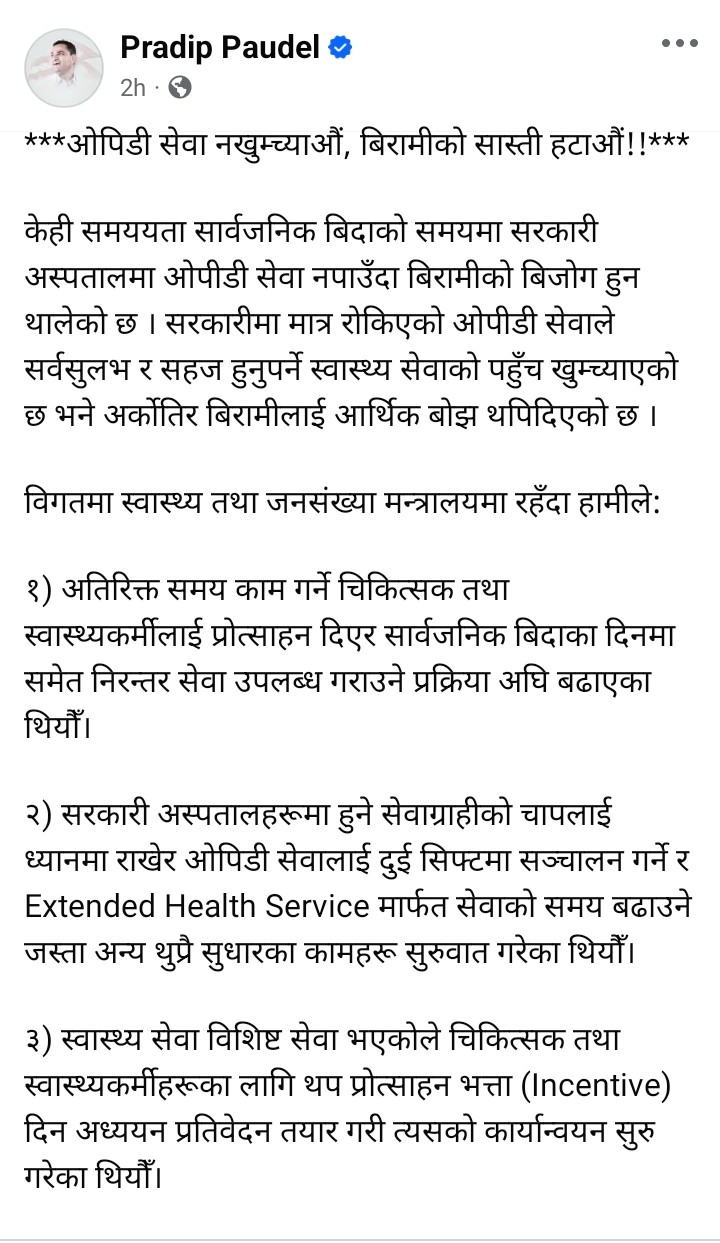 ‘सरकारीमा मात्र रोकिएको ओपीडी सेवाले सर्वसुलभ र सहज हुनुपर्ने स्वास्थ्य सेवाको पहुँच खुम्च्याएको छ भने अर्कोतिर बिरामीलाई आर्थिक बोझ थपिदिएको छ,’ पौडेलले सामाजिक सञ्जाल एक्समा लेखेका छन् ।