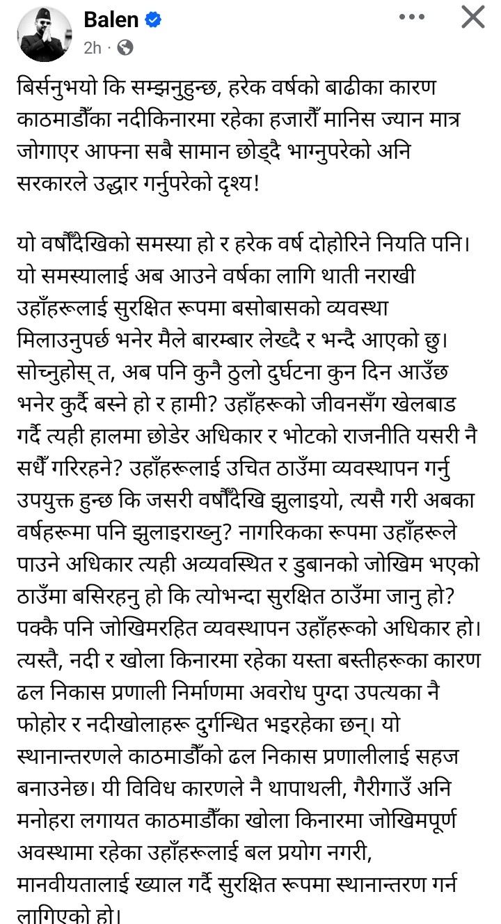 ुनदी र खोला किनारमा रहेका यस्ता बस्तीहरूका कारण ढल निकास प्रणाली निर्माणमा अवरोध पुग्दा उपत्यका नै फोहोर र नदीखोलाहरू दुर्गन्धित भइरहेका छन् । यो स्थानान्तरणले काठमाडौँको ढल निकास प्रणालीलाई सहज बनाउनेछ,उनले लेखेका छन्, यी विविध कारणले नै थापाथली, गैरीगाउँ अनि मनोहरालगायत काठमाडौँका खोला किनारमा जोखिमपूर्ण अवस्थामा रहेका उहाँहरूलाई बल प्रयोग नगरी, मानवीयतालाई ख्याल गर्दै सुरक्षित रूपमा स्थानान्तरण गर्न लागिएको हो ।