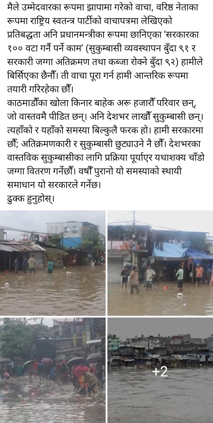 मैले उम्मेदवारका रूपमा झापामा गरेको वाचा, वरिष्ठ नेताका रूपमा राष्ट्रिय स्वतन्त्र पार्टीको वाचापत्रमा लेखिएको प्रतिबद्धता अनि प्रधानमन्त्रीका रूपमा छानिएका ‘सरकारका १०० वटा गर्नै पर्ने काम’ ९सुकुम्बासी व्यवस्थापन बुँदा ९१ र सरकारी जग्गा अतिक्रमण तथा कब्जा रोक्ने बुँदा ९२० हामीले बिर्सिएका छैनौँ । ती वाचा पूरा गर्न हामी आन्तरिक रूपमा तयारी गरिरहेका छौँ, उनले लेखका छन् ।