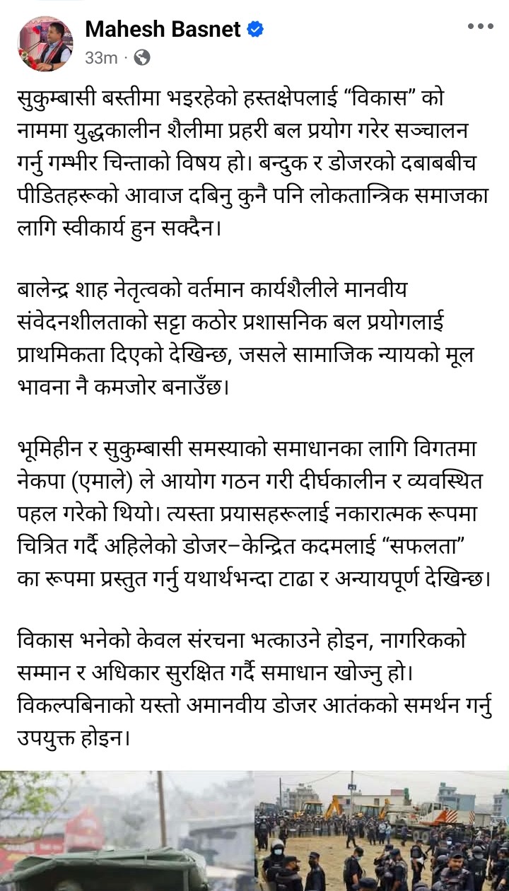 उनले लेखेका छन् सुकुम्बासी बस्तीमा भइरहेको हस्तक्षेपलाई विकासुको नाममा युद्धकालीन शैलीमा प्रहरी बल प्रयोग गरेर सञ्चालन गर्नु गम्भीर चिन्ताको विषय हो । बन्दुक र डोजरको दबाबबीच पीडितहरूको आवाज दबिनु कुनै पनि लोकतान्त्रिक समाजका लागि स्वीकार्य हुन सक्दैन,।