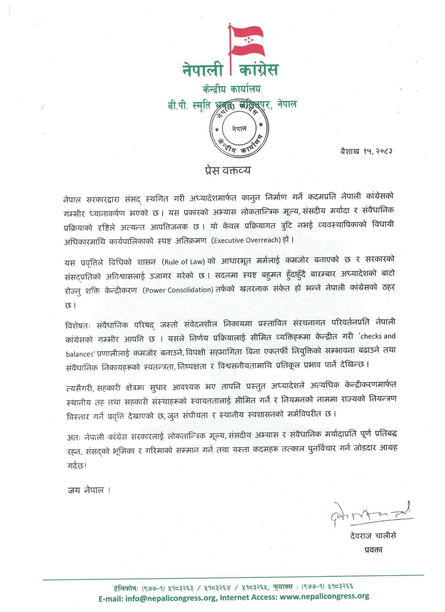 कांग्रेसले सरकारलाई लोकतान्त्रिक मूल्य, संसदीय अभ्यास र संवैधानिक मर्यादाप्रति पूर्ण प्रतिबद्ध रहन, संसद्को भूमिका र गरिमाको सम्मान गर्न तथा यस्ता कदमहरू तत्काल पुनर्विचार गर्न आग्रह गरेको छ ।