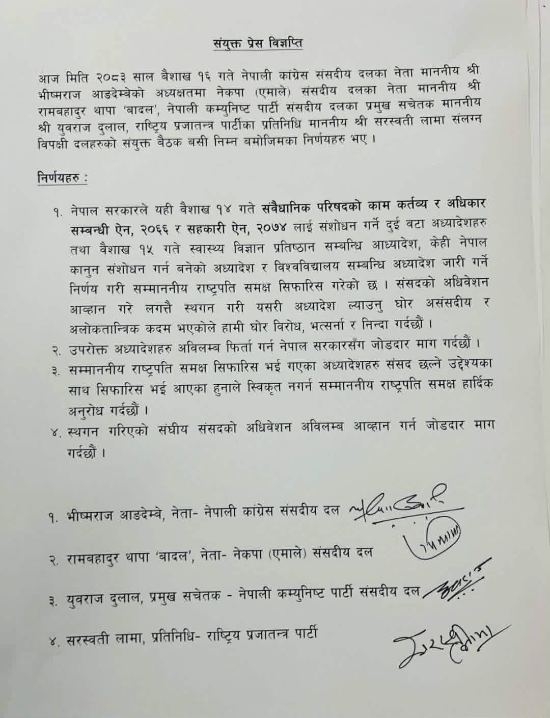 विपक्षी दलको बैठकले सरकारलाई अध्यादेश फिर्ता लिन पनि आह्वान गरेको छ। उनीहरूले तत्काल संसद्को अधिवेशन बोलाउन सरकारसँग माग गरेका छन्।